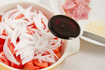 トマト、たまねぎを容器に入れ、卵にぴったんこをかける。